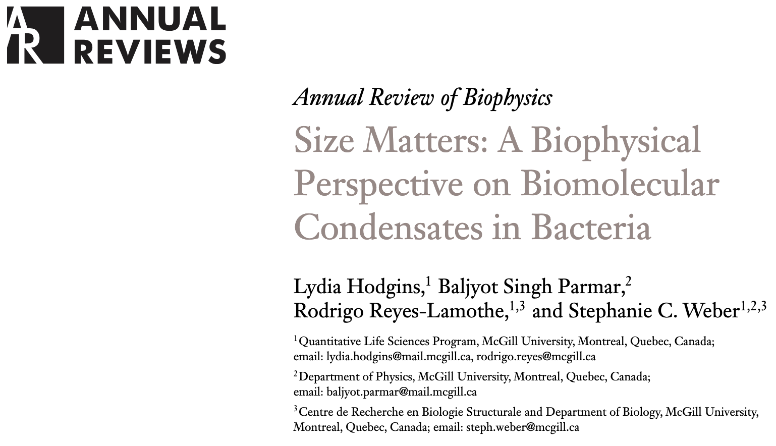 Congratulations to PhD candidate Lydia Hodgins and Weber lab alum Dr. Baljyot Parmar on their review article! Together with Rodrigo Reyes, we discuss how finite-size effects may affect the behavior of bacterial condensates, specific examples (and cellular functions) of endogenous condensates, and the various tools available to study them in live cells. Check it out here!